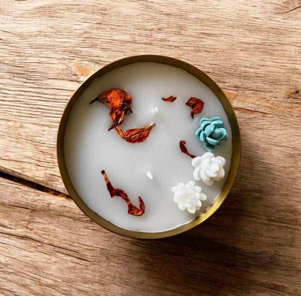White wax base, sprinkled with dried petals inside the shiny brass plate.