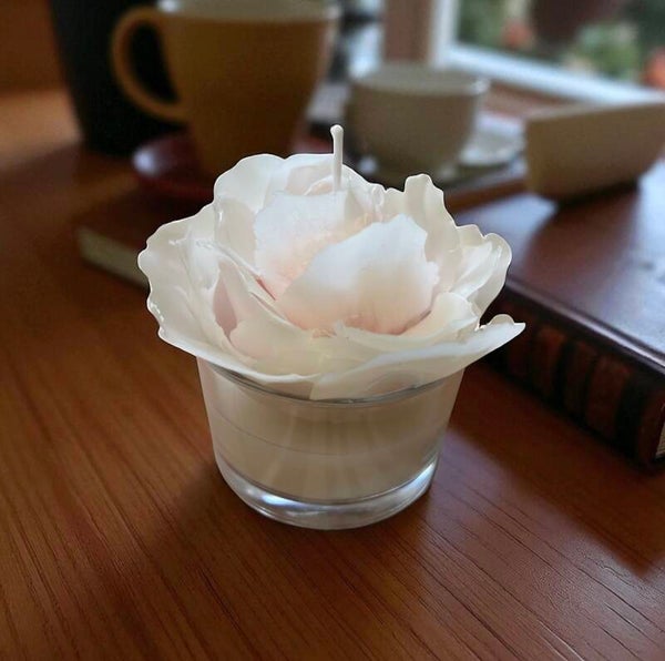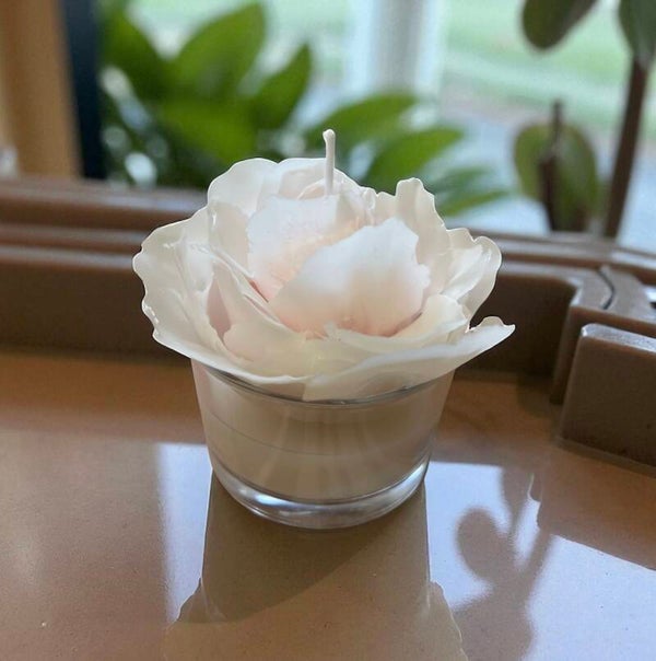 Delicate white rose blossoming inside the 4 OZ clear glass.