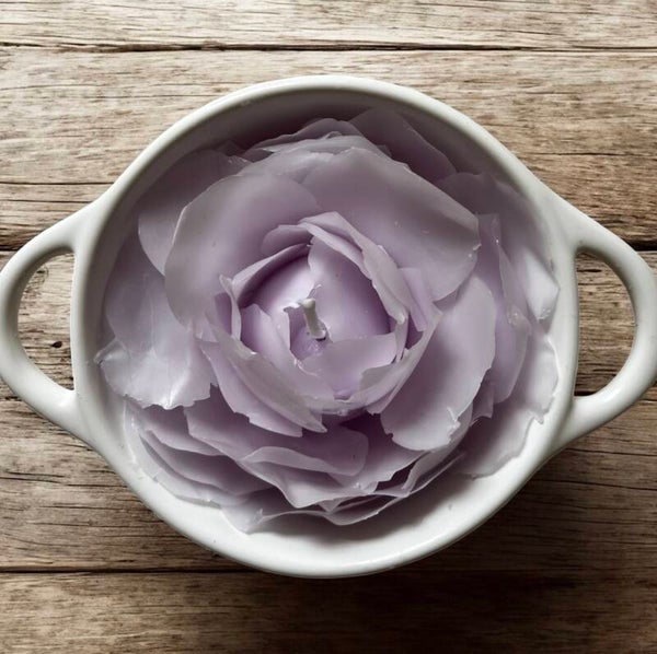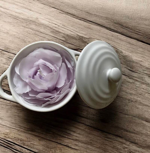 White ceramic pot with a lid. The candle is designed to look like a delicate light lilac rose.