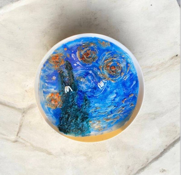 Inspired by Van Gogh’s “Starry Night” with its swirling blue sky and golden stars. Width 9 inches and Height 2 inches