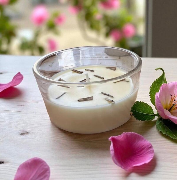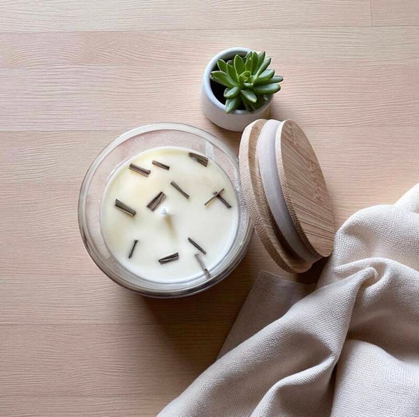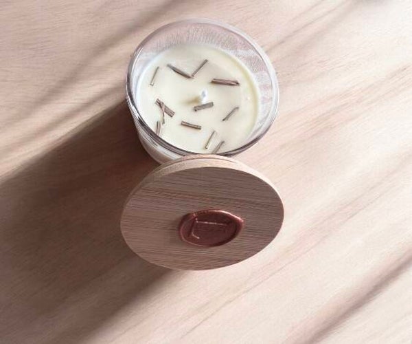 This candle has a clean white wax with pieces of herbs with a natural bamboo lid. 4 oz clear glass 1pcs.