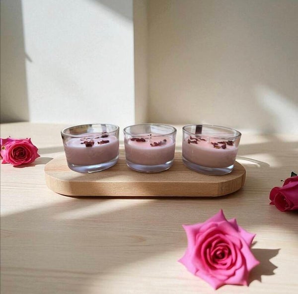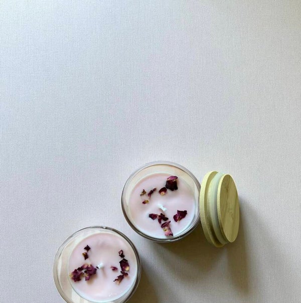 Soft pink wax with dried rose petals on top, in 4 OZ clear jars with bamboo lids.1pcs | Floral aroma