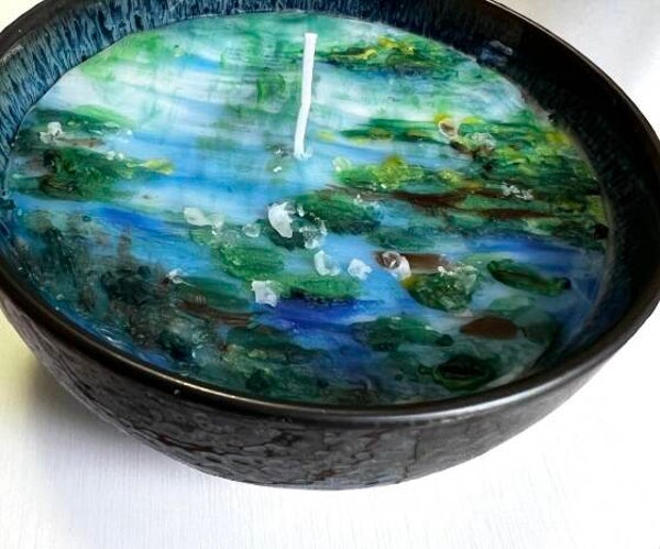The candle’s design and inspired by Claude Monet’s Water Lilies series, one of the most iconic works of Impressionism. Width 5.5 inches and Height 3 inches