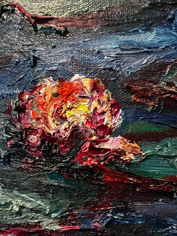 A serene oil painting of water lilies, blending rich texture and vibrant color to capture timeless beauty. This frame is antique-style golden frame with rich, warm finish, enhancing the painting's timeless elegance.