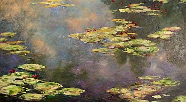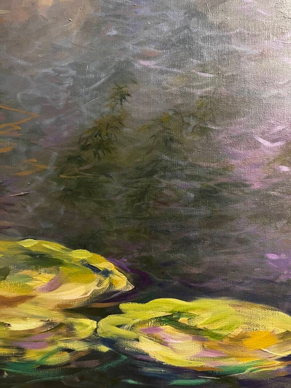 A tranquil oil painting of water lilies,reflecting soft skies and gentle light across the pond's surface. Original Signed Oil Painting on Canvas |Size 36" x 60" inches | Unframed (Ready to Hang)