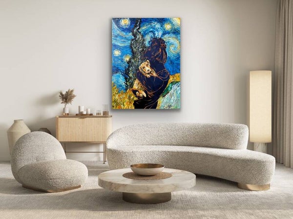 Set against Van Gogh’s starry night sky, this oil painting captures the quiet beauty of companionship. The swirling cosmos contrasts with the tender embrace of a woman and her dog, reminding us that even in life’s vastness, love and connection are our brightest lights.