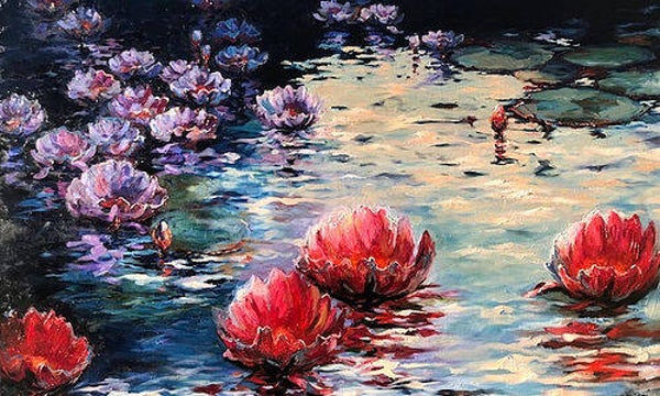 Soft violet and crimson lotus blossoms drift across shimmering waters, their reflections glowing in gentle light. This oil painting evokes calm, beauty, and the quiet poetry of nature.