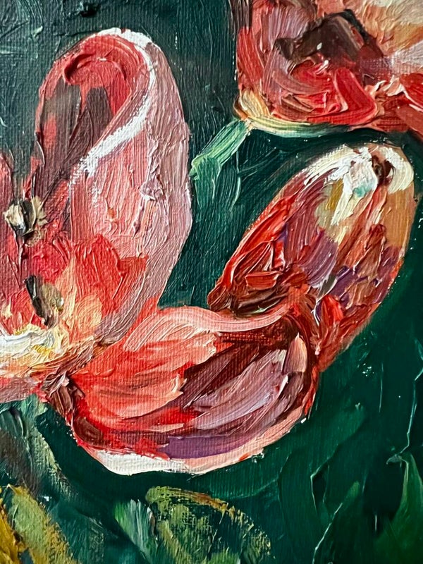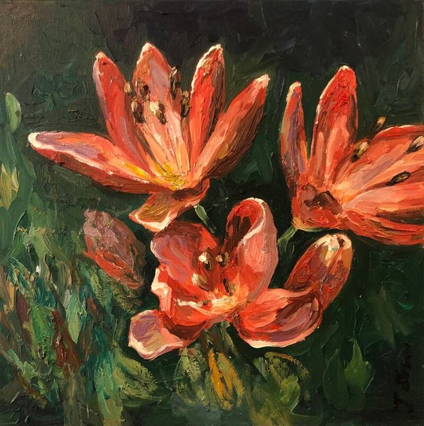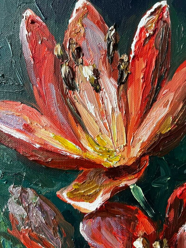 Bold red-orange lilies bloom against a deep green background, their petals alive with texture and light. This oil painting radiates vitality and the timeless beauty of nature in full bloom.
