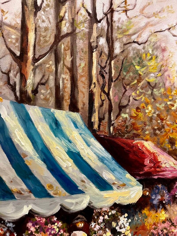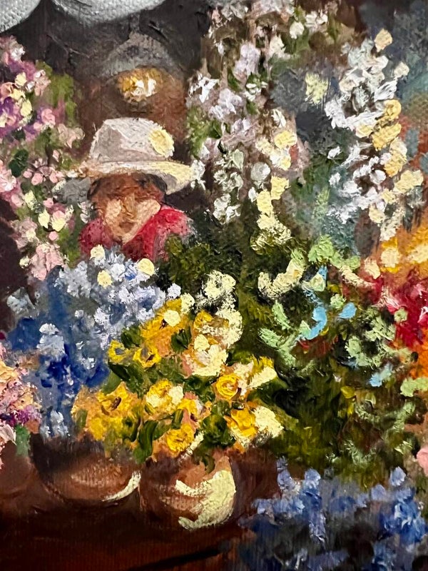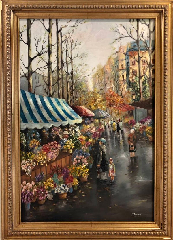 Bustling with charm, this oil painting captures a lively flower market on a rain-washed street. Bright blooms spill from stalls as people stroll beneath striped canopies, bringing the warmth of color to a soft, gray day. This frame is antique-style golden frame with rich, warm finish, enhancing the painting's timeless elegance.