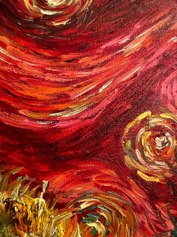 A fiery sky swirls in shades of crimson and rose above golden fields, while a dark cypress tree rises with strength. This oil painting captures movement, passion, and the untamed spirit of nature.