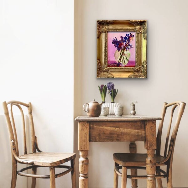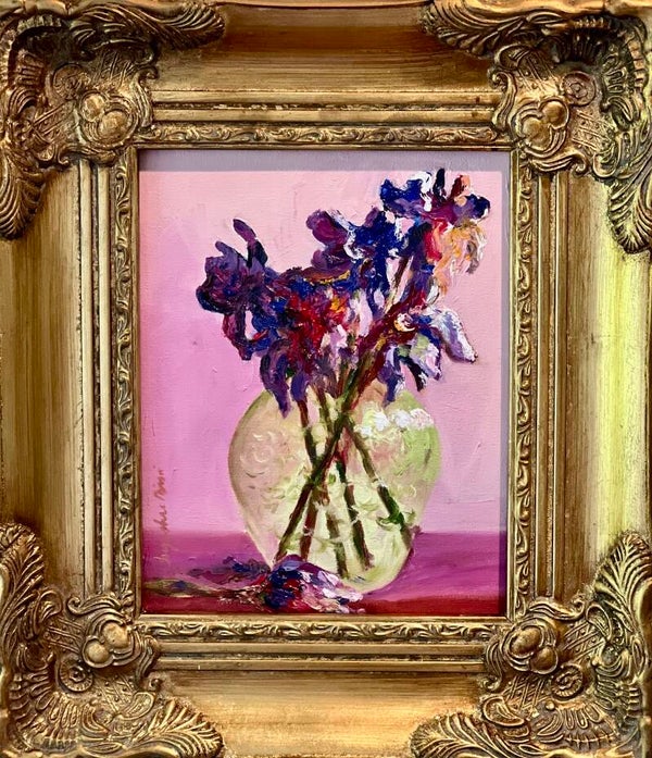 A vivid bouquet of irises bursts with color against a soft pink backdrop. This oil painting captures the beauty of fleeting blooms, blending bold brushstrokes with timeless elegance.