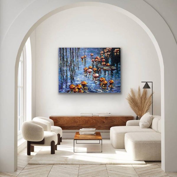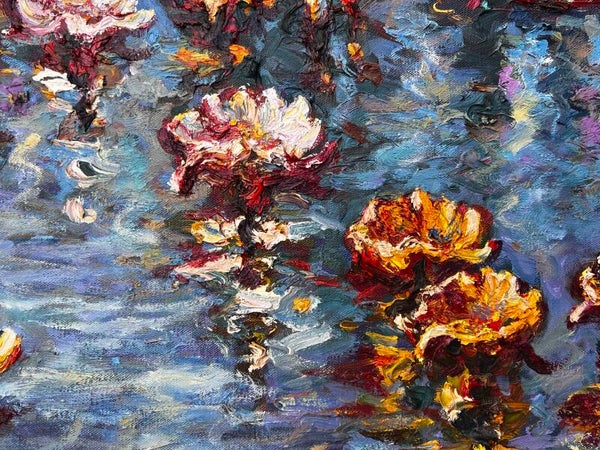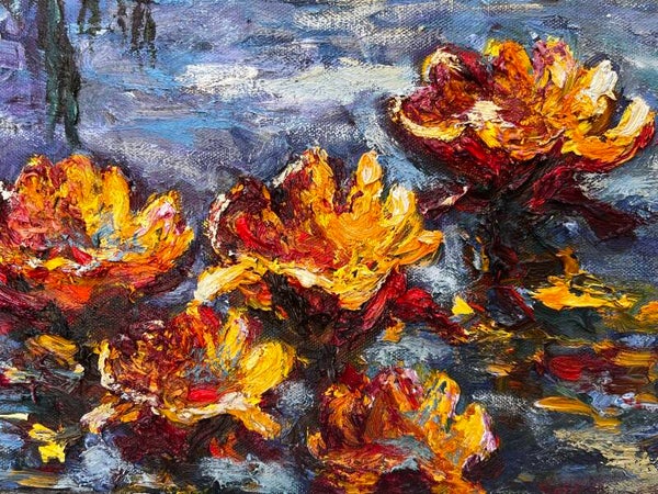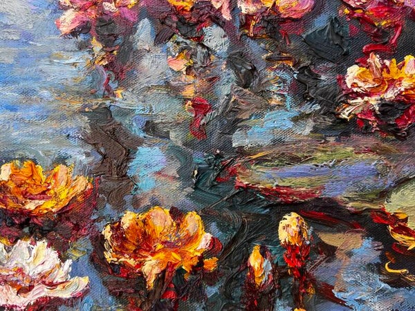 This oil painting captures the serene yet dynamic beauty of water lilies floating across a rippling surface. The deep blues and purples of the water create a dreamy, almost mystical atmosphere, while the fiery yellow and soft pinks of the blossoms bring warmth and contrast to the scene.