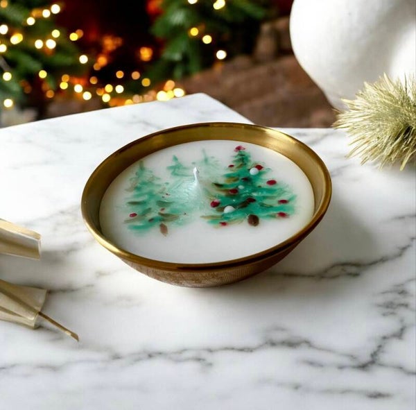 A serene winter wonderland captured in wax — three hand-sculpted evergreens, snowy white base, and festive berry accents create a peaceful holiday forest in candle form.